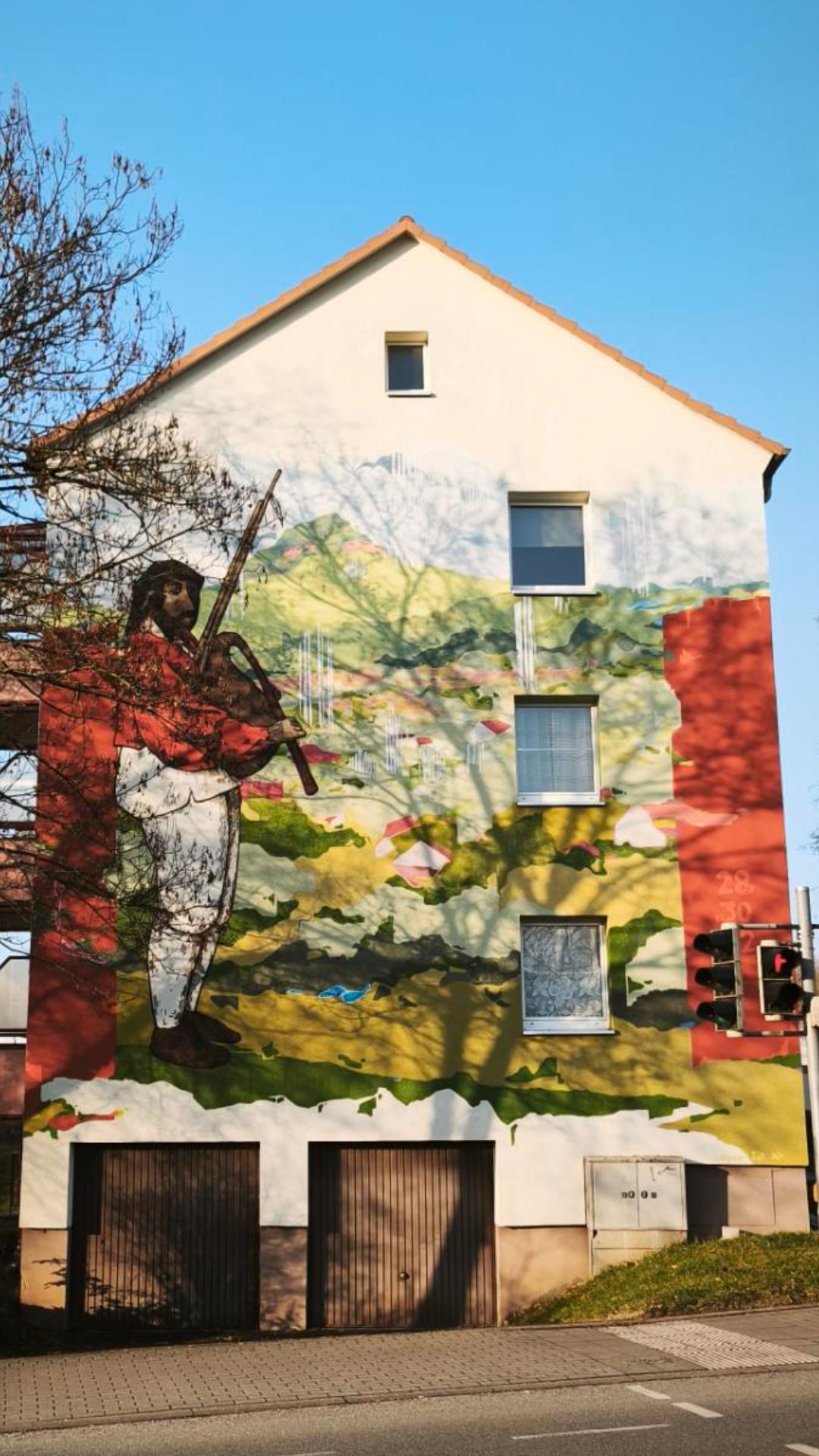 StreetArt! The artwork features a central figure—a bagpipe player—dressed in traditional, rustic attire: a vibrant red tunic, white trousers, and a dark hat. He is depicted in profile, standing atop a green ridge that spans the width of the building.